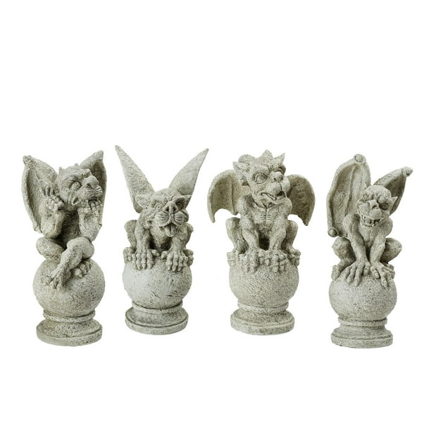 Set Of 4 Decorative Gargoyles On Pedestal Finials Outdoor Garden